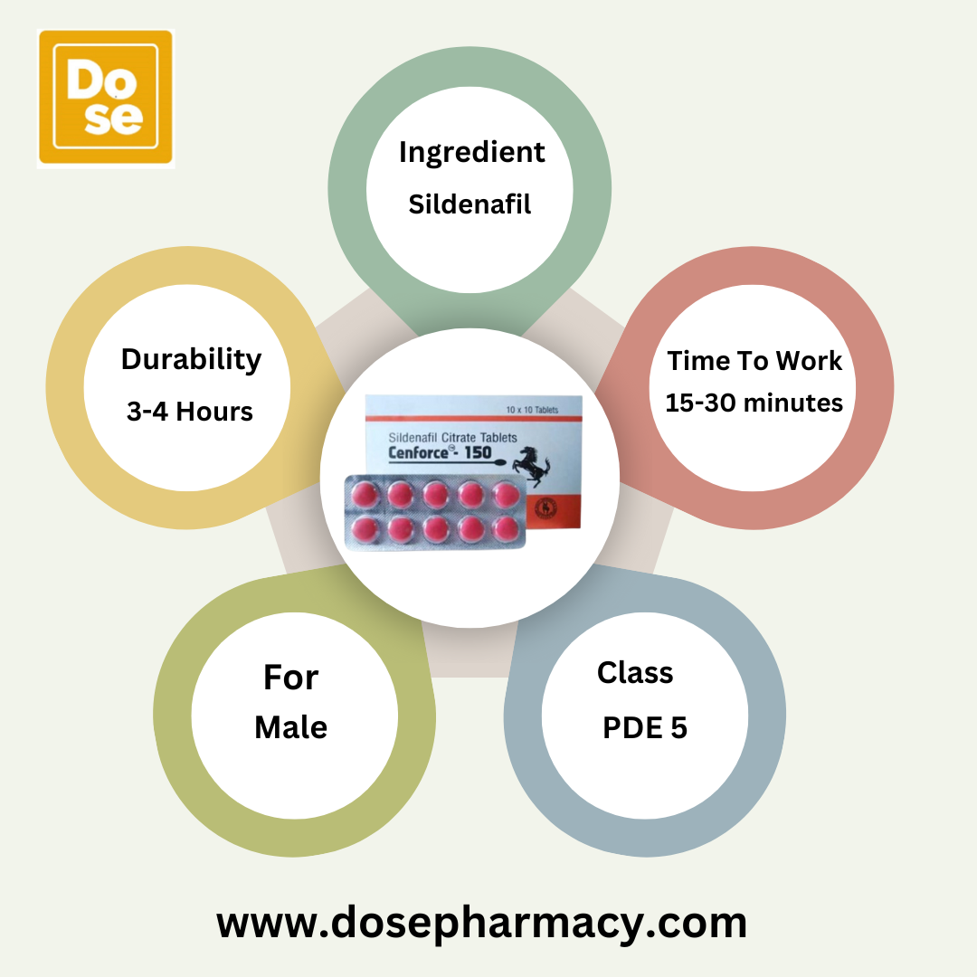 Cenforce 150 from dose pharmacy belongs to a class of drugs known as phosphodiesterase type 5 (PDE5) inhibitors. It helps relax blood vessels and improves circulation, making it easier for a man to get an erection when sexually stimulated. However, it does not increase libido or cure ED permanently—it only works when needed.