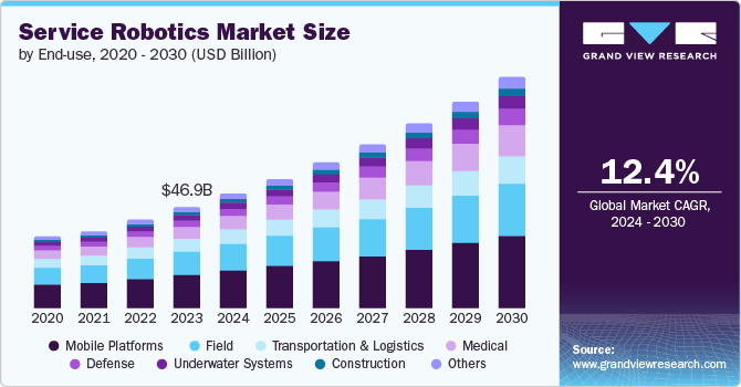 According to a new report by Grand View Research, Inc., the global service robotics market is projected to reach USD 107.75 billion by 2030, growing at a compound annual growth rate (CAGR) of 12.4% from 2024 to 2030. Global demand for service robotics was estimated to exceed 18 million units by 2020. A key factor propelling this growth is the increasing need for assisted living solutions and efforts to offset rising labor costs in developed nations.