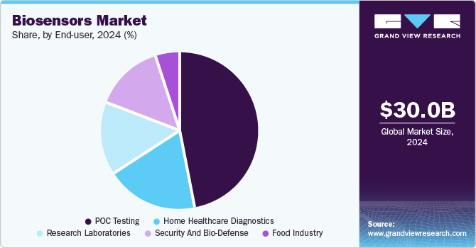 • The end-user segment includes research laboratories, the food industry, home healthcare diagnostics and security POC testing, and bio-defense. Biosensors in point-of-care testing led the market in 2024 accounting for a revenue share of 47.9%. Key factors driving the segment growth include technological advancements that create innovative products, such as ultra-sensitive printable biosensors for PoC applications that help detect or monitor organic fluids like urine, saliva, blood, and sweat.